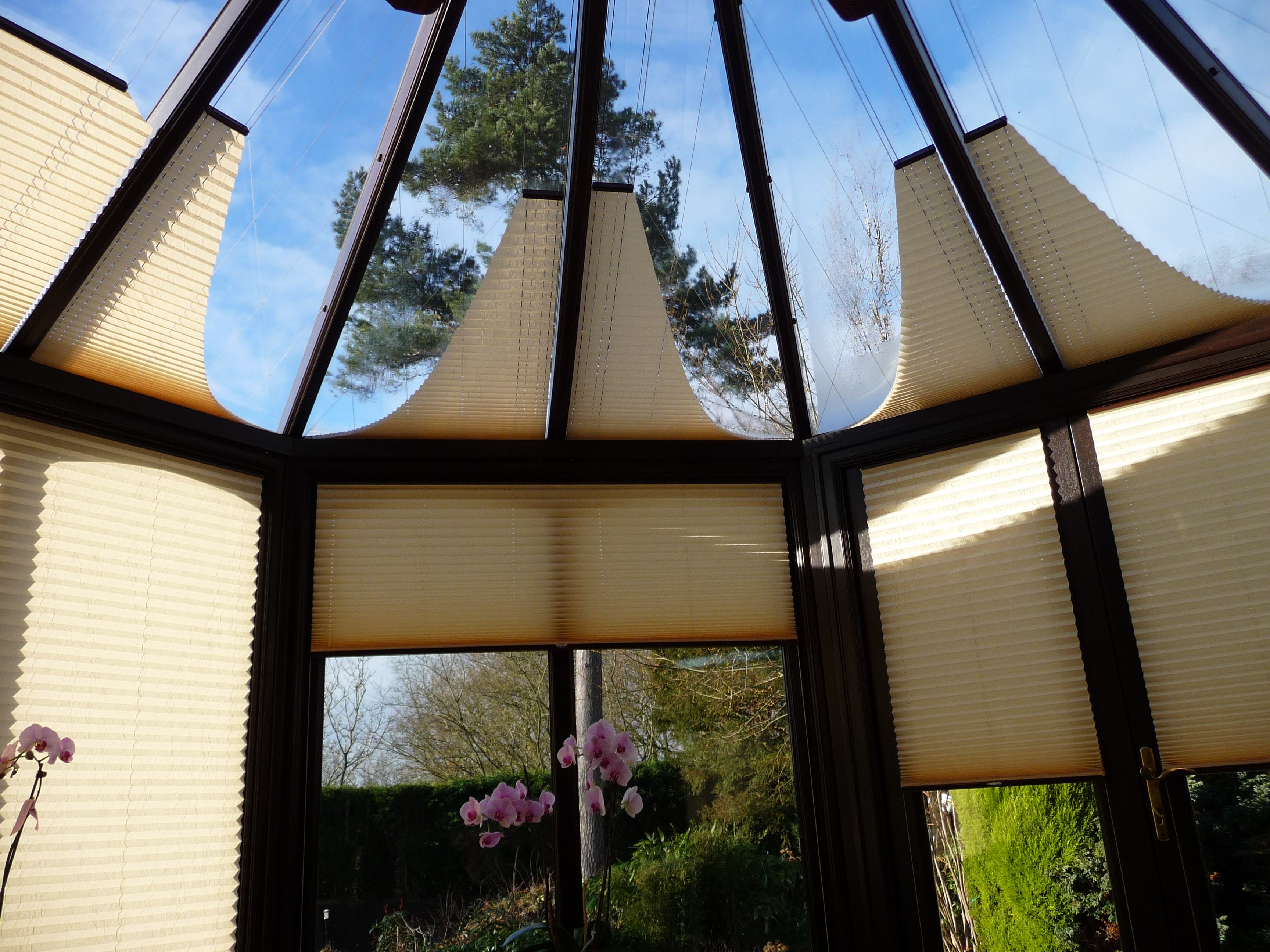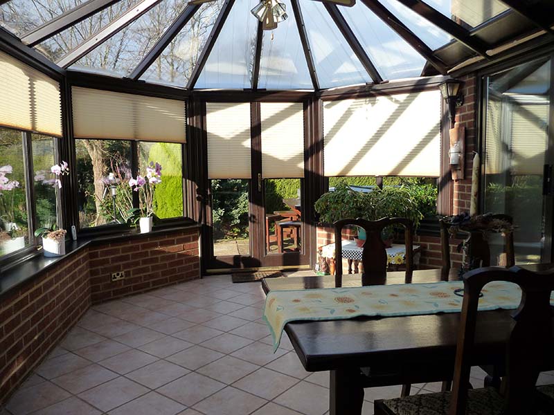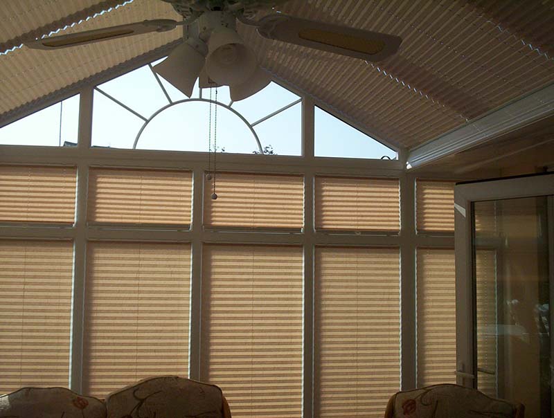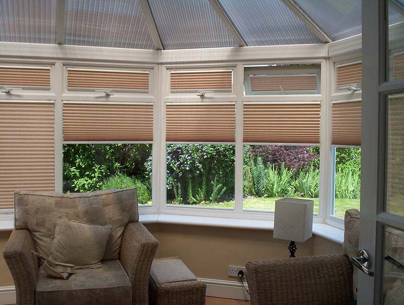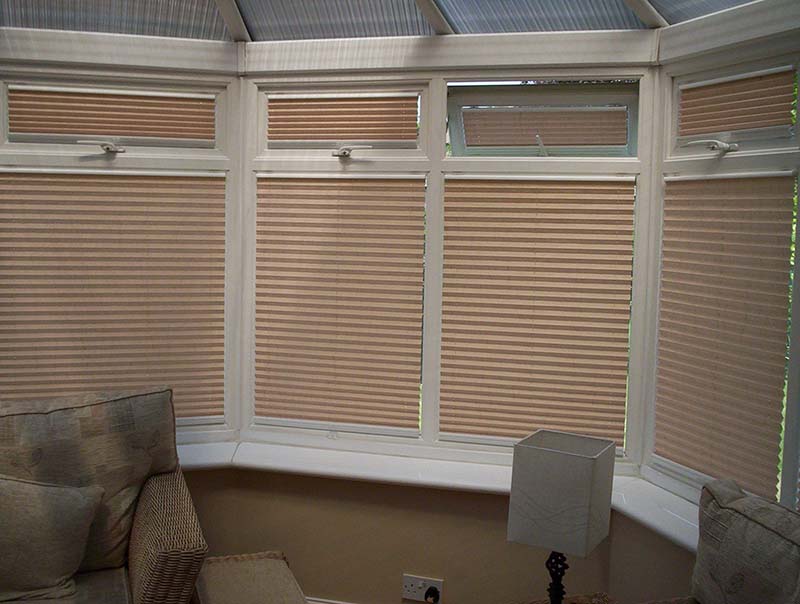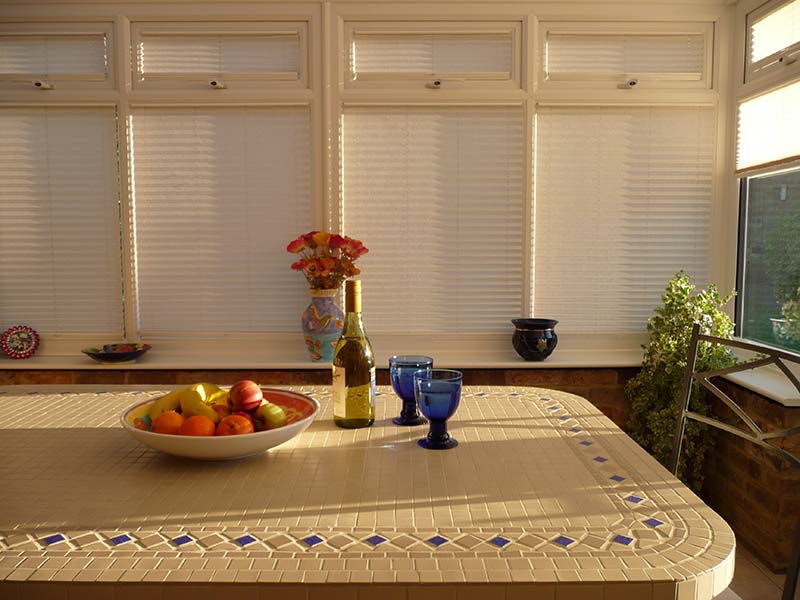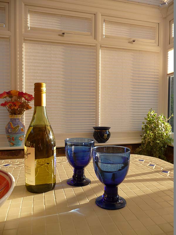 Pli-Sol Pleated Blinds: Ideally suited to tilt 'n' turn windows, Pli-sol has a unique patented cording system that enables guide cords to "disappear" to the sides of the blinds, with no untidy pull-cords. The slim-line rails fit discreetly into the window beading so that the full character of your conservatory is maintained.